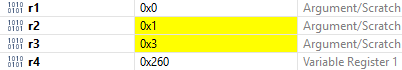 Click the Step Into button a couple of times and you'll see the values of one or more of registers r0 to r3 change and hold the hex value of 1 (0x1), 2 (0x2), 3 (0x3) and 1 again.