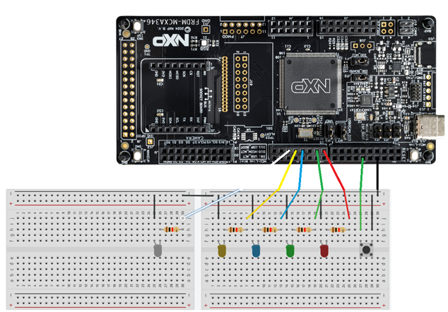 This project demonstrates how to use the gpio_input_interrupt SDK example provided by NXP in the MCUXpresso IDE to tailor it to fit your project. In this case we will use the input interrupt to respond to a breadboard button click in addition to the click on the onboard button on the NXP FRDM MCX A346.