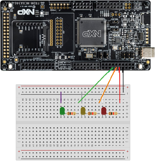 This project demonstrates how to blink multiple LEDs on a breadboard using the NXP FRDM MCX A346 development board, simulating a simple traffic light. It goes beyond the standard MCUXpresso SDK examples and shows how hobbyists can take their first steps into professional embedded programming. The goal is to highlight both accessibility for newcomers and transferable skills in embedded C, hardware setup, and debugging.
